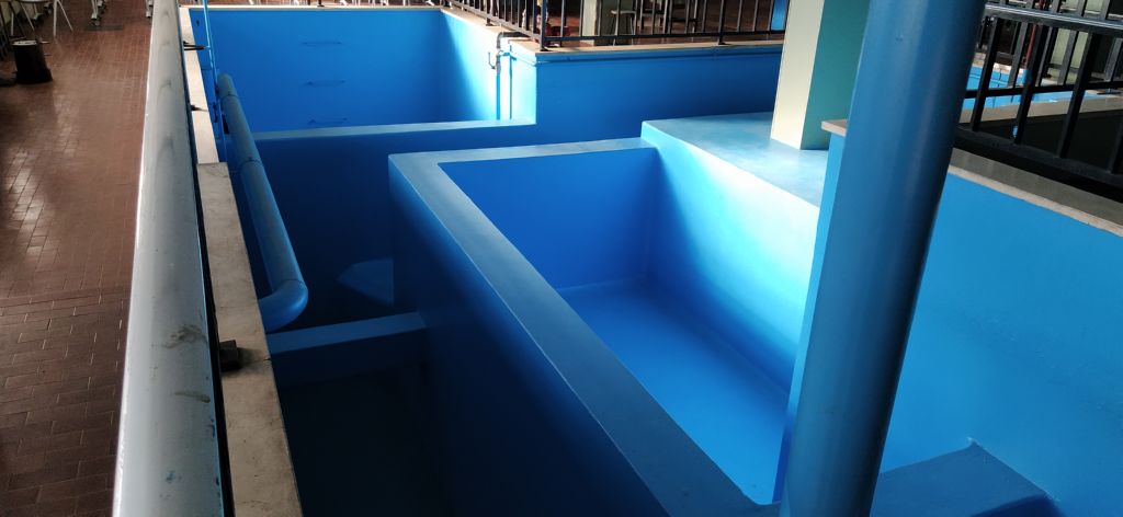Pompe centrifughe e vasca di raccolta acqua.